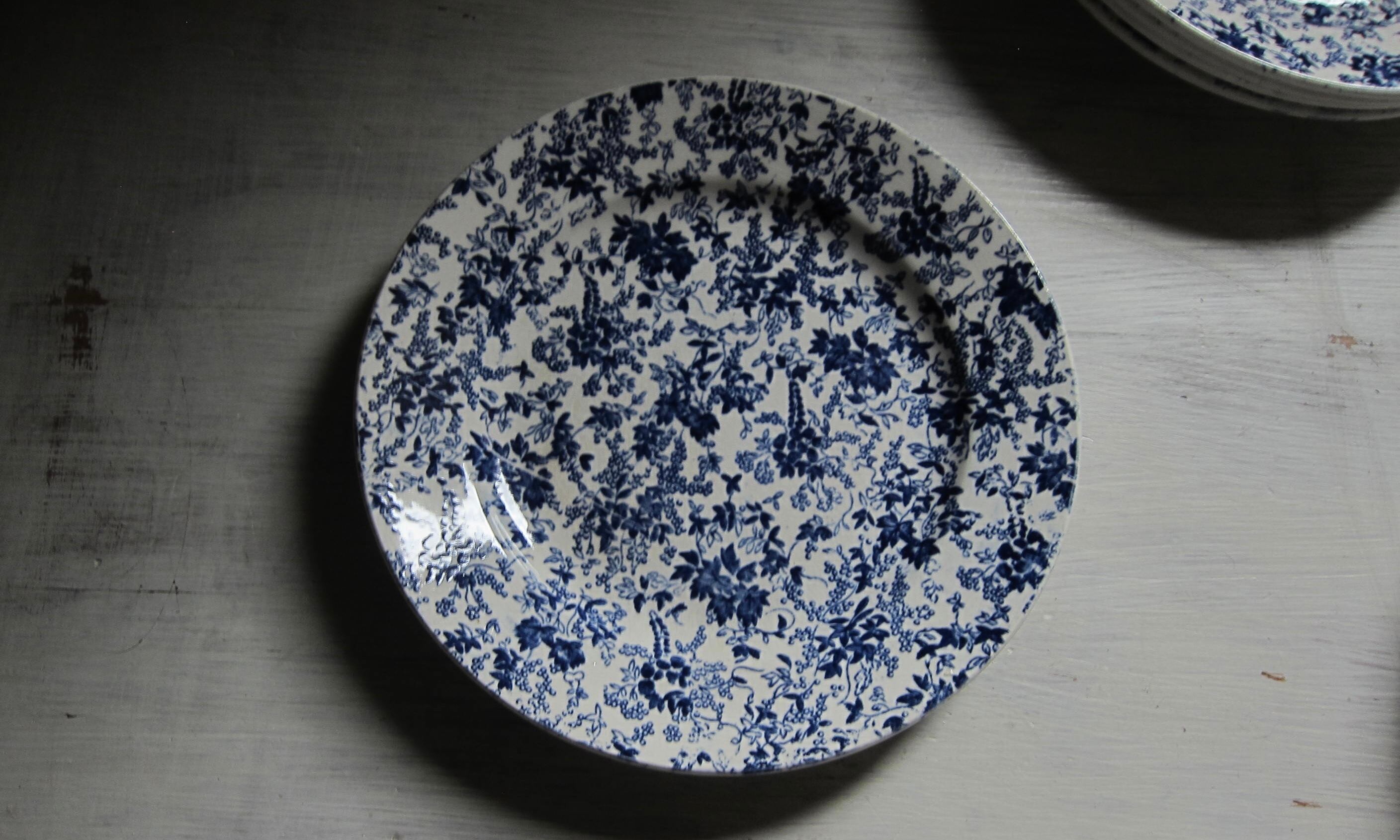 白地にブルーの草花のシノワズリのプリント シノワズリと言っても古典的な柄ではなく